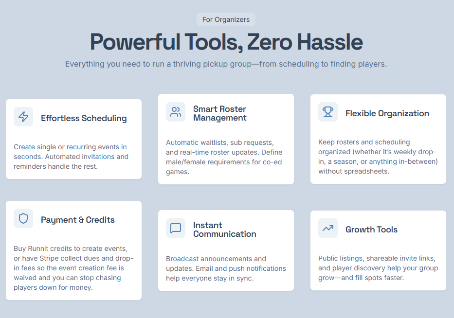 Use Runnit to make organizing predictable: schedule games, track attendance, and keep communication simple.